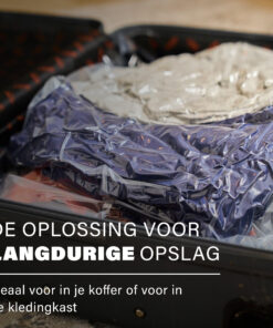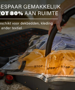 De vacuümzakken zijn vervaardigd van stevig plastic waardoor de opbergzakken helemaal vacuüm blijven. Verder zijn de de zakken vochtbestendig en dankzij het stevige plastic zijn scheurtjes in de zakken verleden tijd. De 2-delige vacuüm opbergzakken set wordt geleverd zonder een klein handpompje. Wij raden aan een stofzuiger te gebruiken voor de XL vacuüm opbergzakken aangezien dit een stuk sneller gaat.